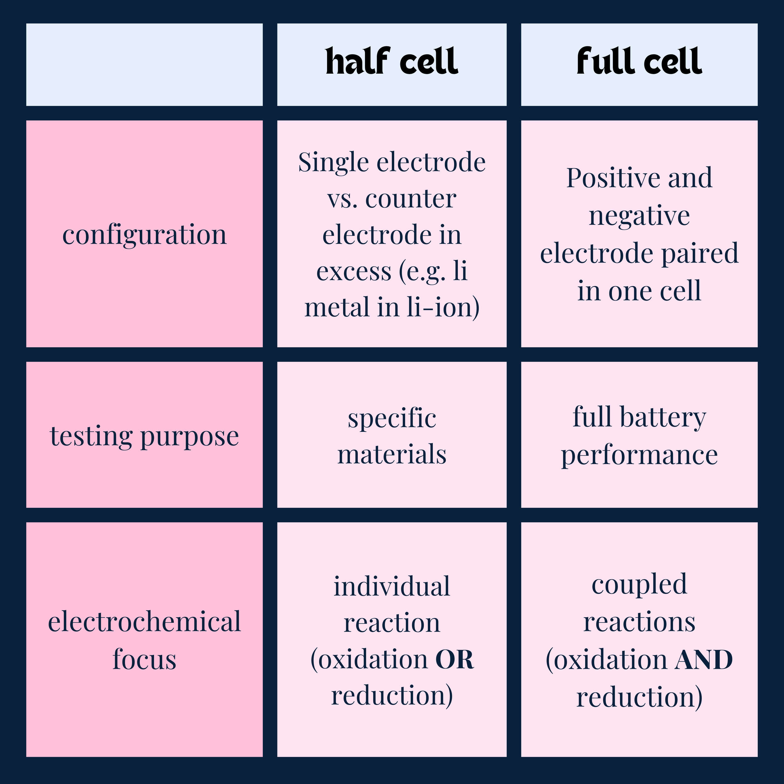 TLDR: a half cell is testing only one commercially viable electrode, and a full cell pairs the two commercial electrodes together to test the complete battery system.